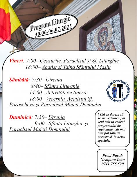 PROGRAM LITURGIC SĂPTĂMÂNA A VI - A DIN POSTUl MARE 30.03-05.04.2026
